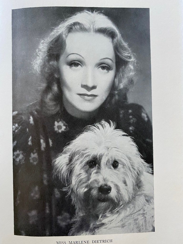 Scruffy is impressed with Denham’s restaurant as a place ‘glittering with stars and other people of importance’ (p. 126), and he even attends Denham’s annual Christmas dance for staff and stars. He was petted by many stars including Marlene Dietrich, Charles Laughton, Elsa Lanchester, Merle Oberon, Robert Donat and, of course, his employer Alexander Korda. Here he poses with Marlene Dietrich and Merle Oberon.