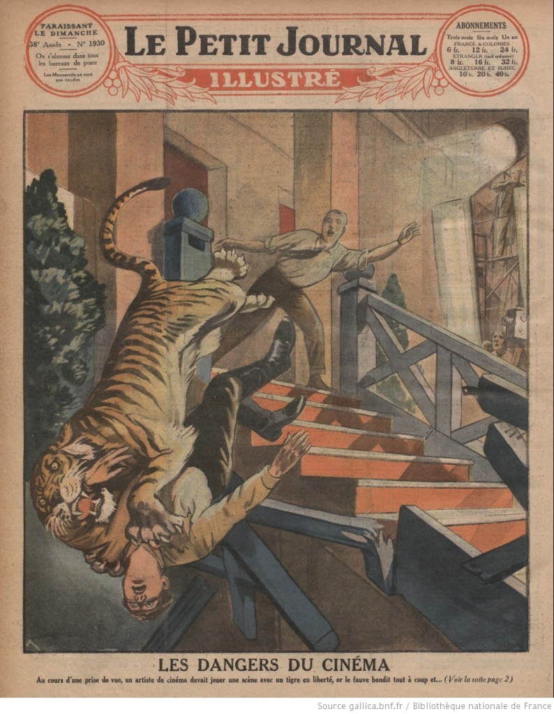 Yet Piel himself could be taken by surprise. In a widely reported incident during shooting at Babelsberg in 1927, he was standing on a staircase when a tiger was released from its cage. In one leap, the animal landed on the stairs, planting its paws on Piel’s shoulders and causing the structure to collapse, graphically illustrated by Le Petit Journal Illustré. Piel plunged more than three metres to the ground and was carried off in an ambulance, severely injured. Nothing was written about the health of the tiger. (“Harry Piel,” Arbeiterwille, 1927:3; Les dangers du cinéma, le petit Journal illustré, 1927: 2.)
