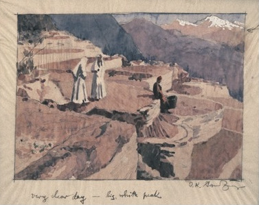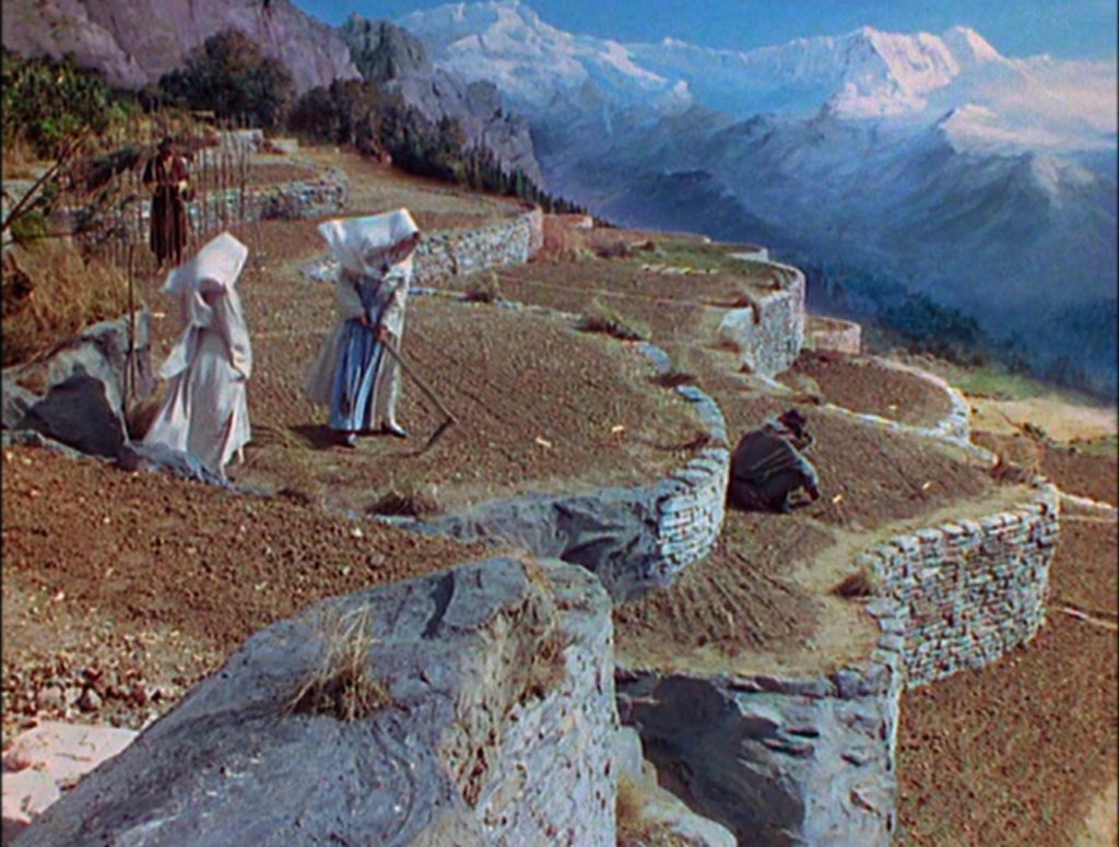 The shots in the film that feature the terrifying precipice were illusions created by the matte artist Percy C. Day. Many of the locations were scenes painted on glass. Jack Cardiff explained how they would ‘matte out the NG [no good] parts of the frame with black card very exactly and then rephotograph the painted glass with mountains and clouds as a second exposure of the film’ (Bowyer 2003: 73). These techniques made it possible to work with the challenging demands of lighting for Technicolor since glass shots and matte painting facilitated the manufacture of exteriors in the studio where light conditions could be more highly controlled than on location. Day wrote that such relatively simple forms of special effect were nevertheless very important: ‘For even though nothing of outstanding photographic originality is aimed at, the fundamental purpose of the shot is achieved in that what would have proved a tricky and dangerous shot was rendered one of simplicity’ (Kinematograph Weekly Studio Supplement, 2 Oct 1947: xvii). For Black Narcissus Day used a new method which meant tests did not have to be shot in the first instance, enabling the film to be developed and printed straight away. He explained: ‘When the required takes have been selected, a decision is made where the matte shall be placed, always bearing in mind that it must not encroach on any part of the image where there is action, and also considering whether there is any addition in the way of movement, such as clouds, which play an important part in outdoor scenes. The matte line should follow dark shapes, such as shadows. Having decided on these points, the image is painted on to glass to match the image of the film projected upon it, following the line where the two have to be photographed to complete the whole’ (Kinematograph Weekly, 29 Jan 1948: 27-8). The illustrations below show Junge’s drawing as the basis for Day’s matte technique, and the same scene in the final film.
