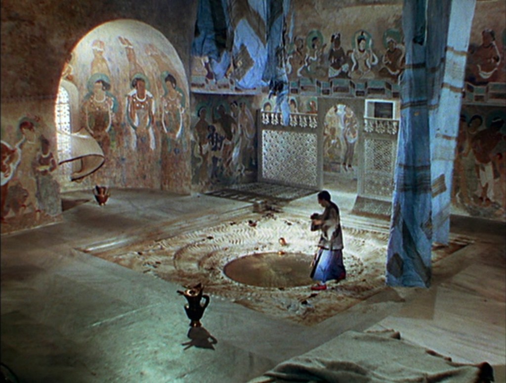 Junge’s drawings included the wall paintings that do much to ensure the continued presence of the palace’s past use as a harem, even when its purpose has been completely changed into a convent. These images of the designs and how they were filmed on set, erected for the camera’s viewpoint and then how they appeared in the final film, also show the cycle of invention that contemporary studio practices enabled.