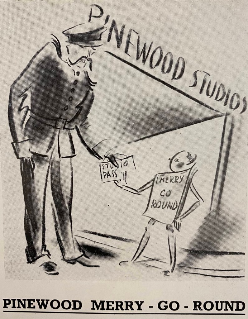 The first issue’s editorial declared the Pinewood Merry-Go-Round’s purpose as ‘an interesting, informative and amusing magazine for all Pinewood people, written and illustrated by them’. It stated further that: ‘Nothing will be included that is not of interest to Studio people themselves. It must be remembered however, that copies are bound to find their way into the hands of “outsiders”, so we must make every effort to do ourselves justice’. The magazine was posted free of charge to every member of the studios once a month, and the Acting Editor Joy Redmond, a film publicity director, called for contributions: ‘We need short stories, cartoons, details of any hobbies you have, technical articles that are of interest to us all; sketches, amusing incidents and bits of gossip that are always happening in the studios and hundreds of other items that will make the magazine representative of you all’. Redmond was succeeded as Editor in October 1946 by journalist Tom Moore who occupied the role for the magazine’s short lifetime. The magazine provided a ‘pass’ into the studio like no other, as captured by this cartoon printed in the first issue.