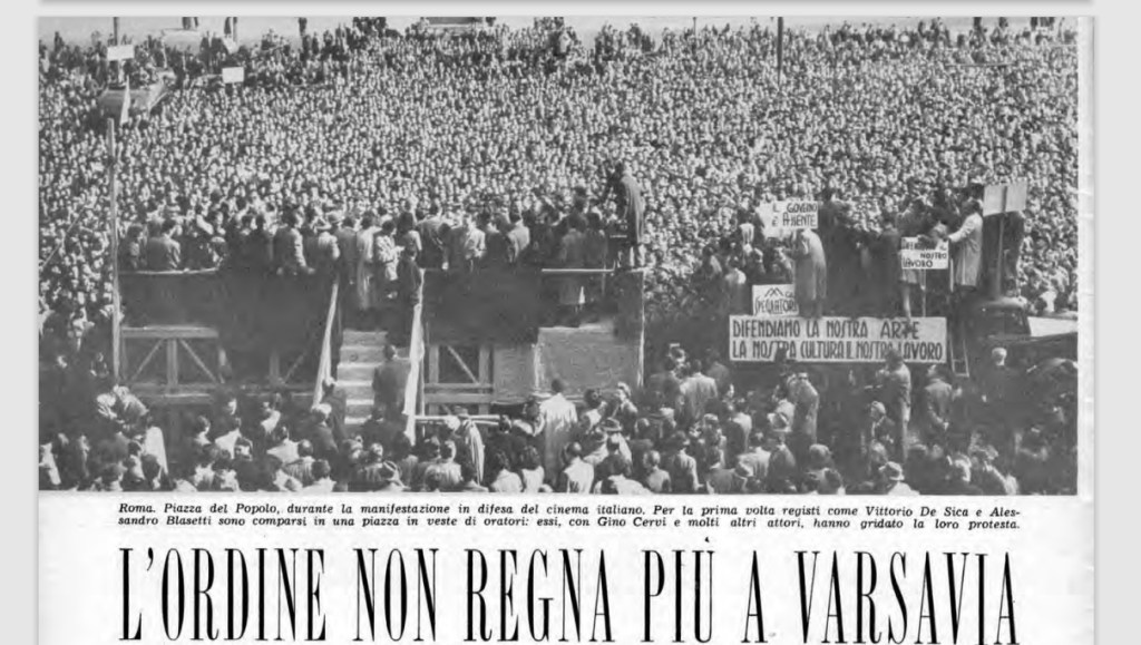 Speeches turned into a march as workers flowed into the central Corso Emanuele heading towards the offices of the Direzione Generale dello Spettacolo in via Veneto, where some of the placards that accompanied the protest were eventually laid down. Some read: ‘The government is absent’, ‘Down with speculators’, ‘Let’s defend our art our culture our jobs!’ (Cinema, 1949: 296-298). According to the film magazine Cinema, the police rapid response unit known as ‘la Celere’ was called in, diverting the peaceful march of film workers quite abruptly (1949: 261). According to the national newspaper Corriere d’Informazione (1949), the police were called in to stop the march because it had not been authorised. Another ‘ploy to intimidate and divide [us]’, objected film director Giuseppe De Santis, concluding: ‘we must insist […] the battle has just begun’ (Cinema, 1949: 261).