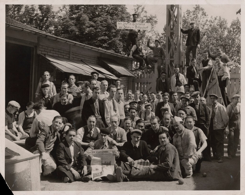 Strikes were experienced as a festive moment, a ‘joyful’ communion between workers (Weil 1951). During the two weeks of occupation, film studio strikers’ daily life consisted of union meetings to discuss the demands to be made, but also of leisure activities such as ball games, ‘radio-crochet’ and, of course, film screenings. Dancing, however, was prohibited at the Joinville studios, ostensibly ‘to reassure jealous wives’ (Derain 1936). Time was also spent on the logistics of the occupation (e.g., sleeping arrangements, food supplies, cleaning the stages and workshops), often relying on the support of the neighbouring population. In the short documentary film Grèves d’occupation (1936, dir. unknown) which evokes the daily life of the Parisian strikers, one can see a large billboard painted by the Joinville strikers announcing ‘a procession of gladiators’, ‘a stilt race’ or the election of the ‘Queen of the Pathé strikers’.
