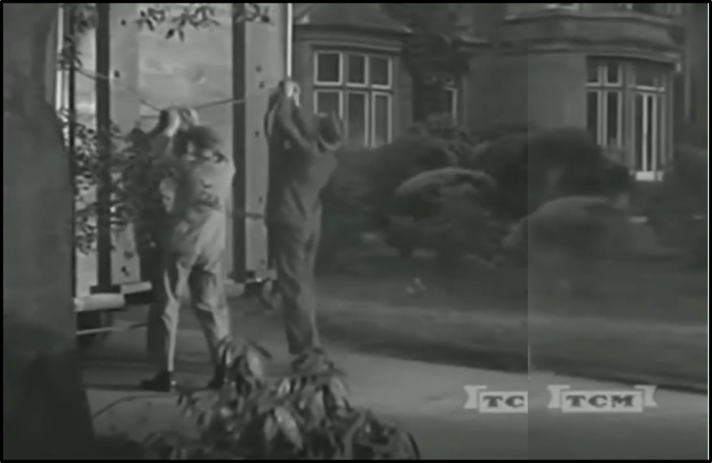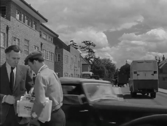 They Drive by Night also shows off another part of the studio designed to function as an exterior set. When the carpenters’ shop was extended as part of the 1936-37 expansion, it was constructed so that its longer western wall resembled a short street, constructed from a range of different aged and shaped buildings to give the impression that it had grown over time, while its northern wall, which faced the Thames, provided a ‘more or less Grecian elevation’. The scheme was approved in July 1936, despite the objections of B. R Davidge, who was employed by Teddington Urban District Council as a Town Planning consultant: ‘The design for the carpenter’s shop extension appears to be unnecessarily elaborate and rather suggests that it is being built up of surplus sets no longer required for filming purposes’ (Davidge). Davidge appears to have fundamentally misunderstood the purpose of the workshop’s unusual exterior. When completed the newly enlarged building was ready to step into the background, and can be seen in They Drive by Night, shot at an oblique angle, with props such as a poster for a boxing bout and a sign for the ‘Pins and Needles Club’ adding a touch of local colour. In the back of the shot, a flat has been erected perpendicular to the street, provide greater depth and solidity to the illusory urban scene and blocking out the grounds that ran down to the Thames. I have not yet identified any cinematic appearances by the river-facing ‘Grecian elevation,’ but would be very interested to hear from anyone who has, or from anyone who has spotted studio buildings in any other films made at Teddington.