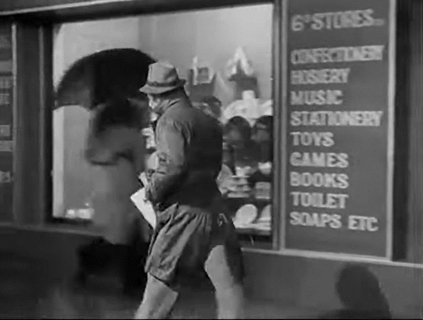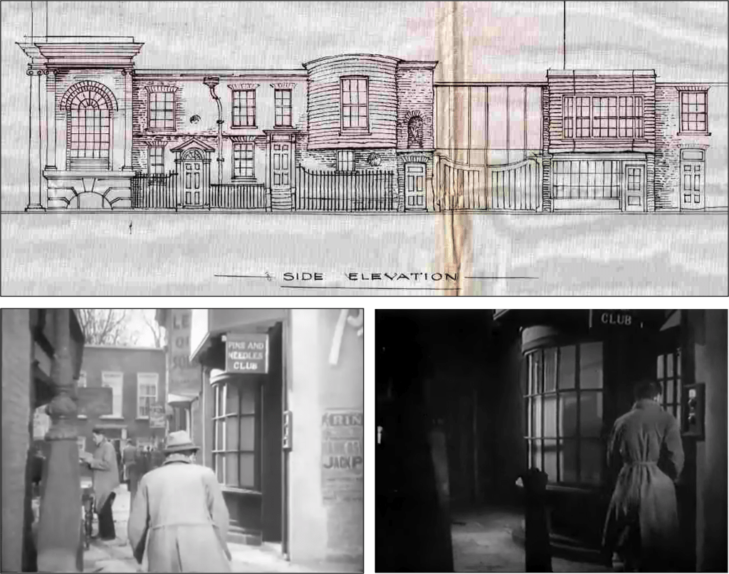 In this latter film, the stage’s large ground-floor windows can also be seen acting as both shop windows and, boarded over, as advertising hoardings on the outside wall of the dancehall. Here, even though the camera movement that captures the space is ostensibly similar – a tracking pan from right to left – we get a sense of how changes to props, on-screen weather and the speed with which the camera moves encourage us to see the building in different ways, and so convince the viewer that they are looking at two different places. The windows of the ‘6d Stores,’ seen on a rainy night, are staged to create a sense of depth, showing off such items as canned foods, cups and plates under bright diegetic lights; advertising for the palais, on the other hand, is staged essentially two-dimensionally, with posters pasted onto the flat surface of a wall and depth instead provided by a post box and a lamppost that pass by in the foreground of the shot. Each shot only lasts a few seconds, but great care has evidently been taken to develop comprehensively different versions of the same 50-ft. stretch of wall, on the other side of which, beyond the camera’s gaze, could be found a scene dock and accommodation for the studio’s sound van.