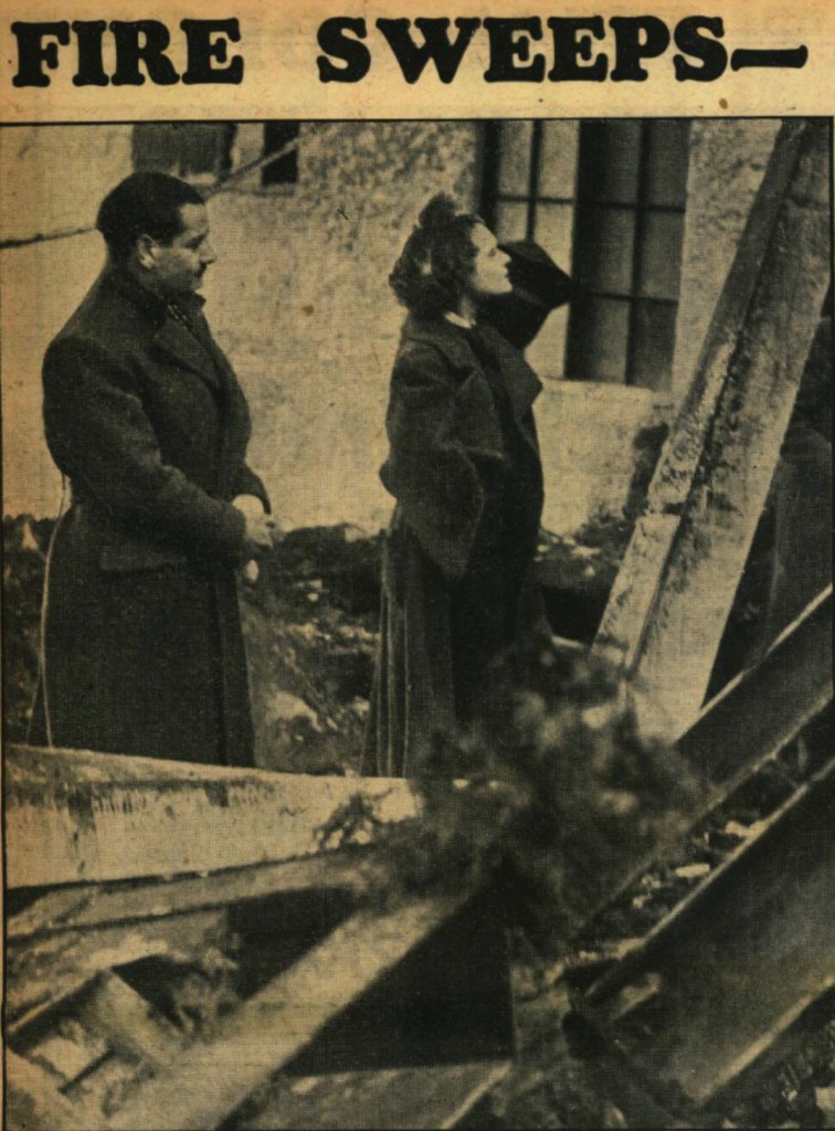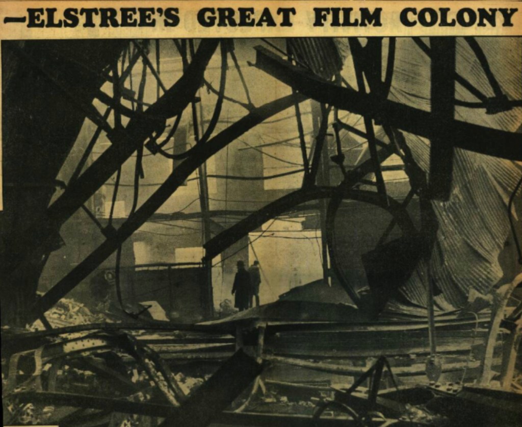On Sunday 9th February 1936 film producer Herbert Wilcox lay awake in the early hours of the morning at his home located high up on Deacons Hill Road overlooking the British and Dominions’ Imperial Studios he’d founded at Elstree in 1930. He recalled with horror: ‘I could not sleep. I got up and wandered over to the window. A red glow filled the sky. I looked at the source. It was a huge fire at the studios – my studios!’ (Wilcox, 1967: 109). Wearing his pjs under an overcoat, he rushed to the blazing site, rescuing films stored in the vault. Other recorded witnesses to the disaster were cinematographers Jack Cardiff and Ronald Neame who also saw the fire’s glow from a house where they were lodging opposite the studios (Cardiff, 1996: 33-5). They rescued cameras and even shot some footage (believed lost) of the fire as it destroyed three stages, 44 dressing rooms, 24 offices, three reception rooms, a converting room, and a wax shaving room (used in sound recording). British International Pictures (BIP) were also affected, losing three of their adjacent nine stages at Elstree, the central recording dept, and 36 dressing rooms and offices. About 1000 workers were reported as being temporarily thrown out of work by the disaster (Illustrated London News, 15 Feb 1936: 1). A Gaumont British newsreel captured aerial shots of the fire.